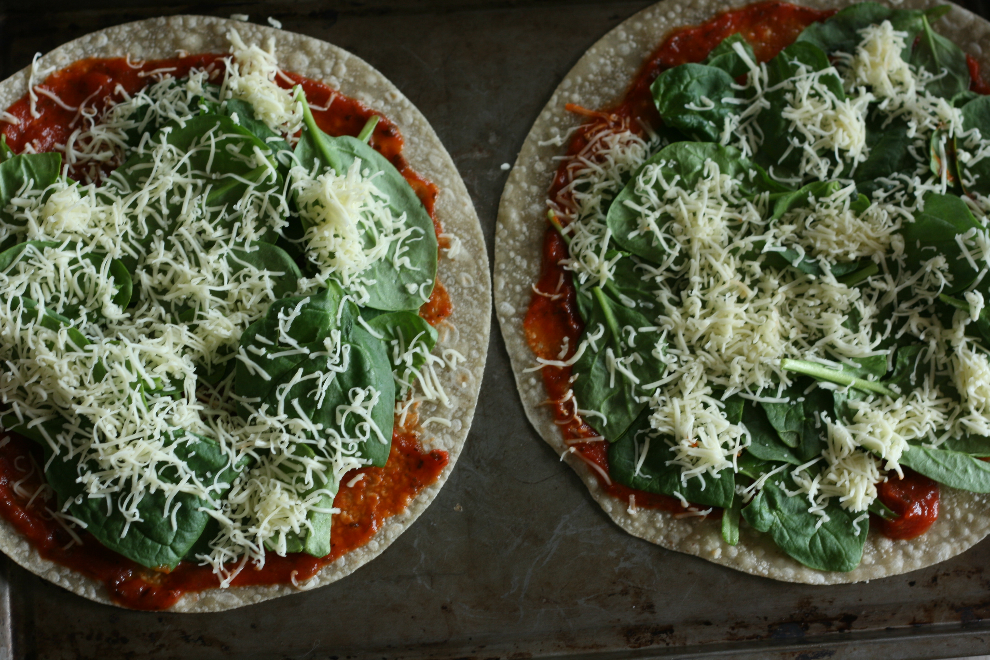 Place 2 rice tortillas on a cookie sheet, add approx. 2 Tbsp. of tomato sauce, a handful of spinach leaves per tortilla, followed by the shredded cheese. We usually use about 1 oz. of cheese per tortilla, but you can easily adapt this to your own taste. Finally, top with a second rice tortilla. Bake in the oven until the cheese melts, and the quesadilla is slightly crispy and golden brown.
