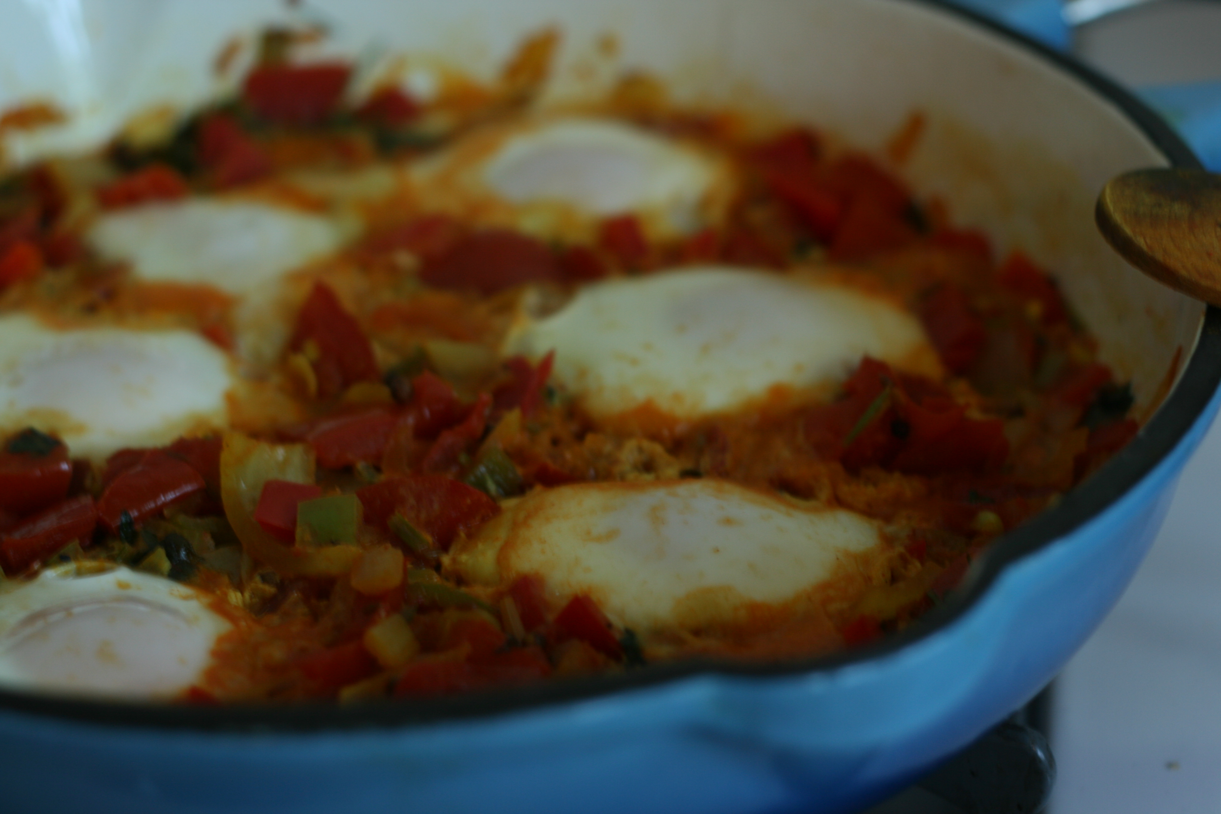 Spread the tomato, pepper, and onion mixture in an even, smooth layer over the bottom of the pan. Create a separate hollow to break in each egg. Put the lid back on and cook for an additional 8-10 minutes, until the eggs are completely cooked. Before serving, you should see 6-8 separate ‘sunny side up eggs’ scattered throughout the tomato mixture. Spoon the eggs and sauce over gluten free toast, or rice. Serve and enjoy. YUM!