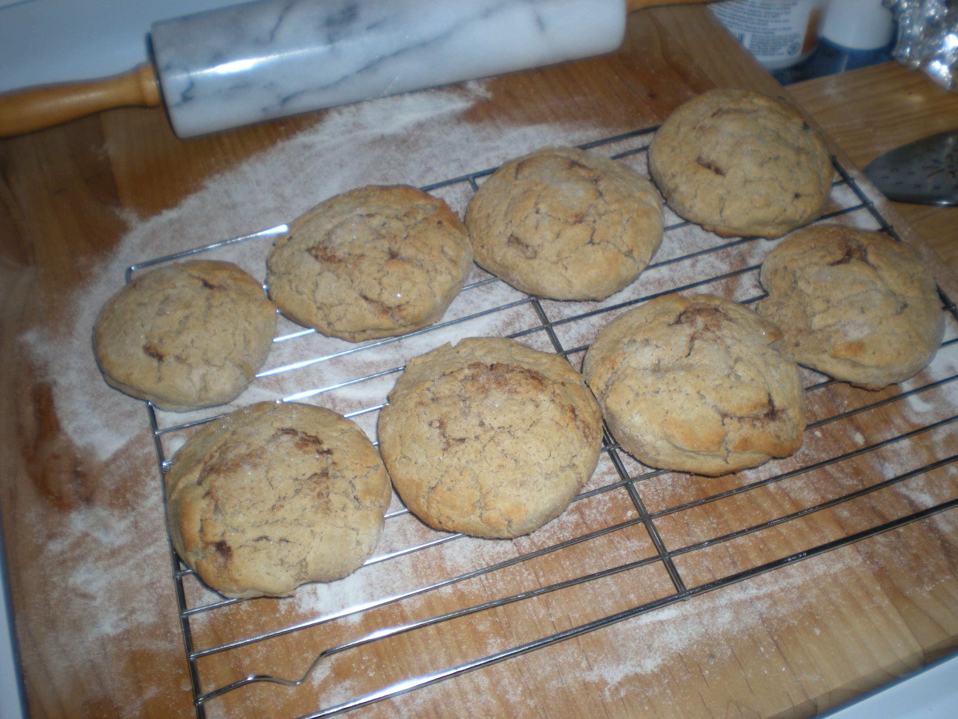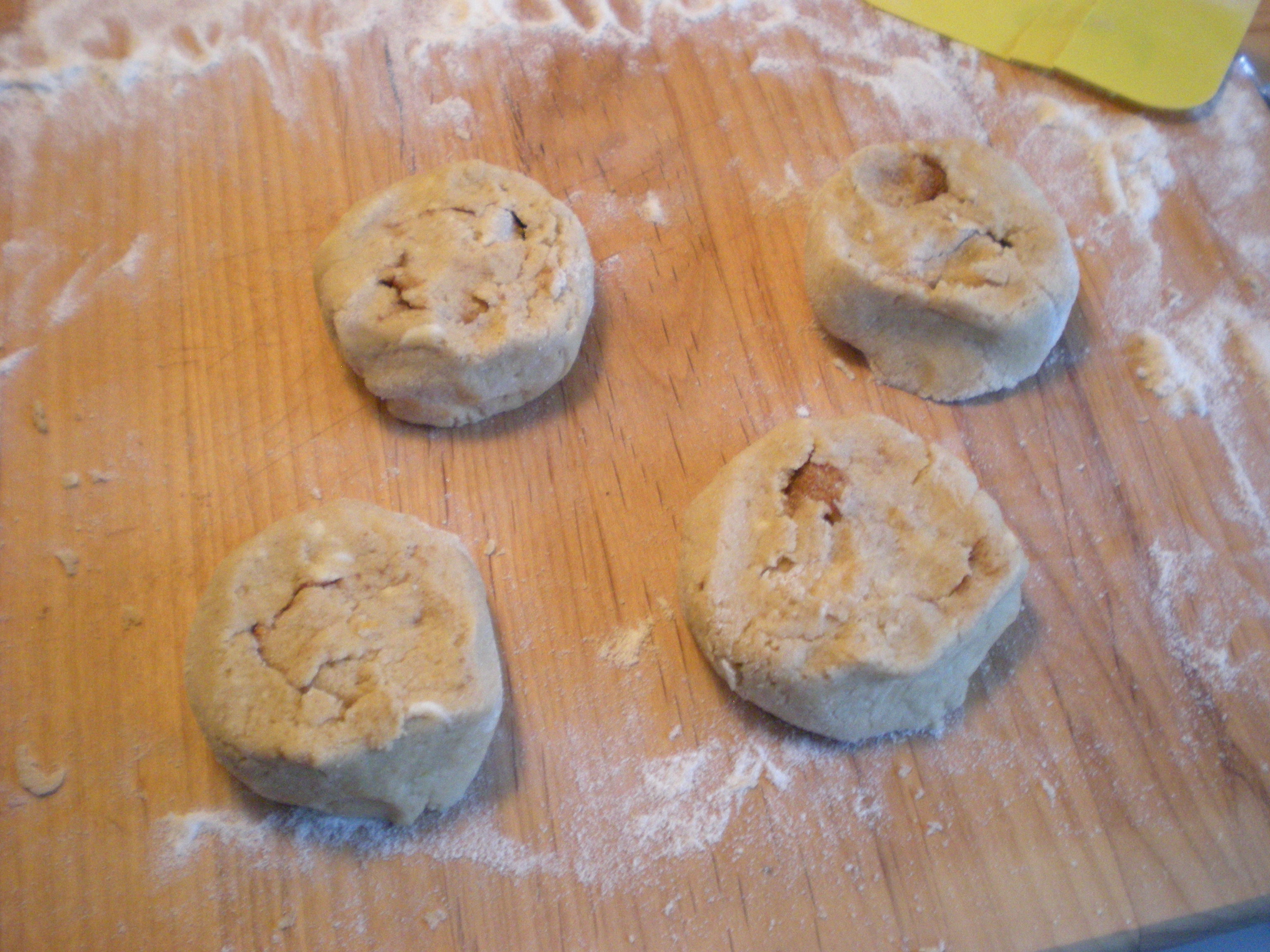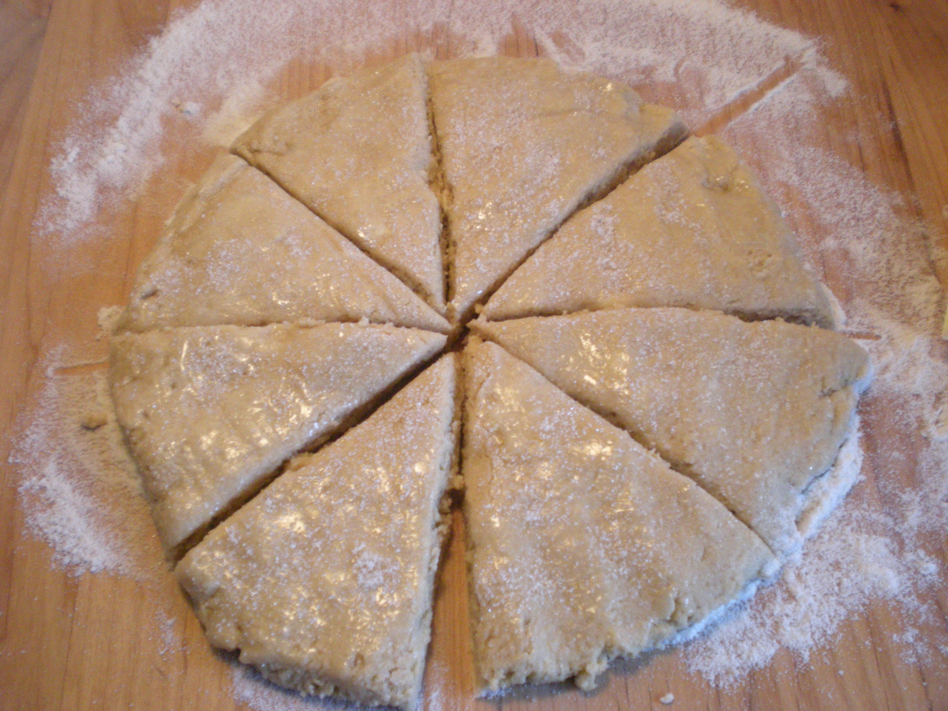 Cut the roll in half, then cut each side in half again, until you created 8 slices. Shape each slice into a flat, round scone.