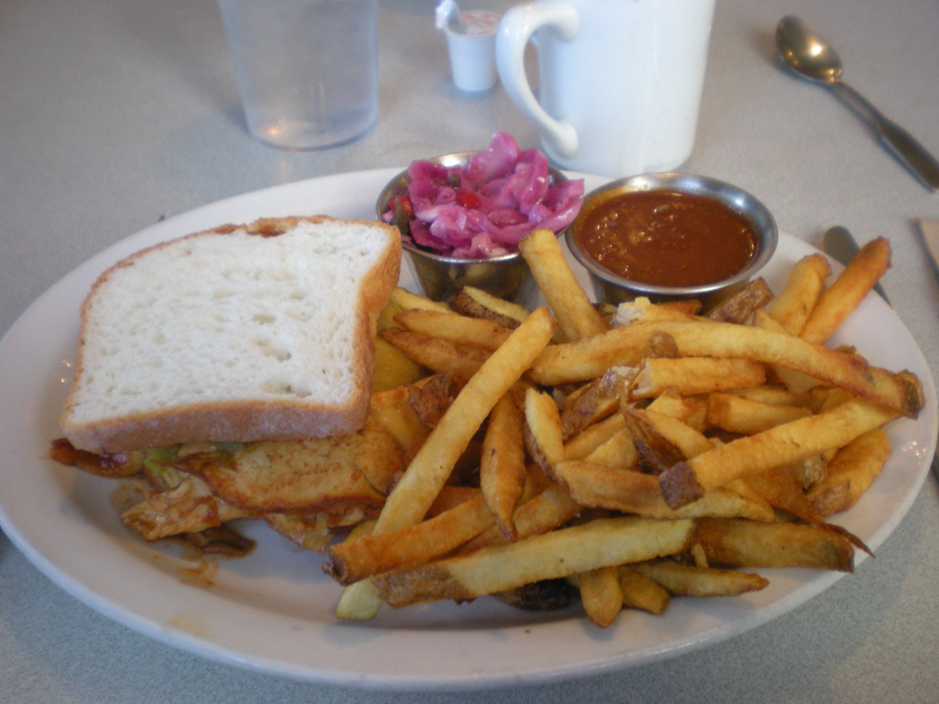 and a Smoked BBQ Chicken Sandwich with fries, salsa, coleslaw, and BBQ sauce, on gluten free bread.
