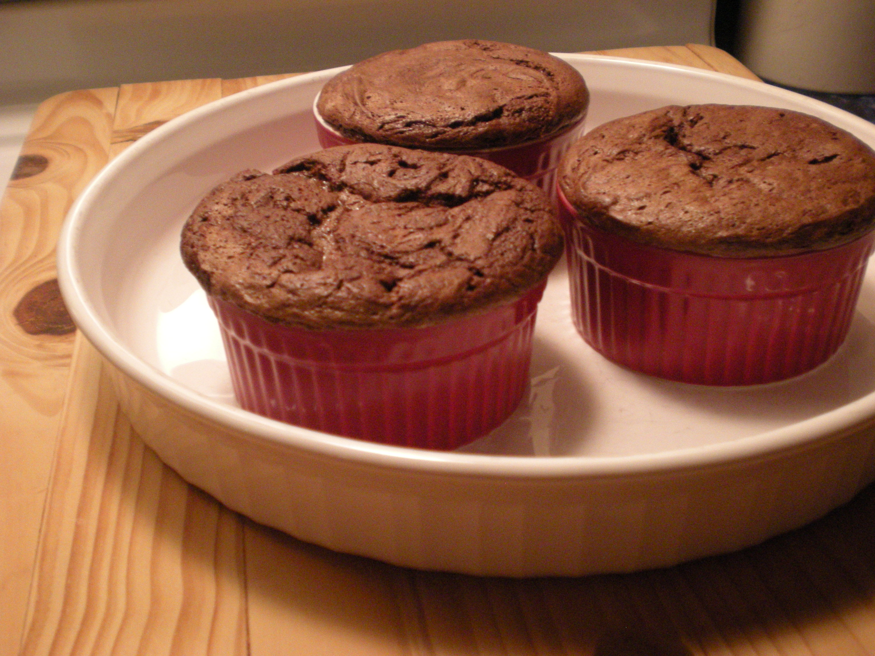 Add about 1/2-inch of water to the bottom of the glass baking dish and bake until the mousse puffs up (about 30 minutes). It should be lightly cracked around the edges, but still moist in the center. Remove from the oven and let cool for about 10 minutes before serving.