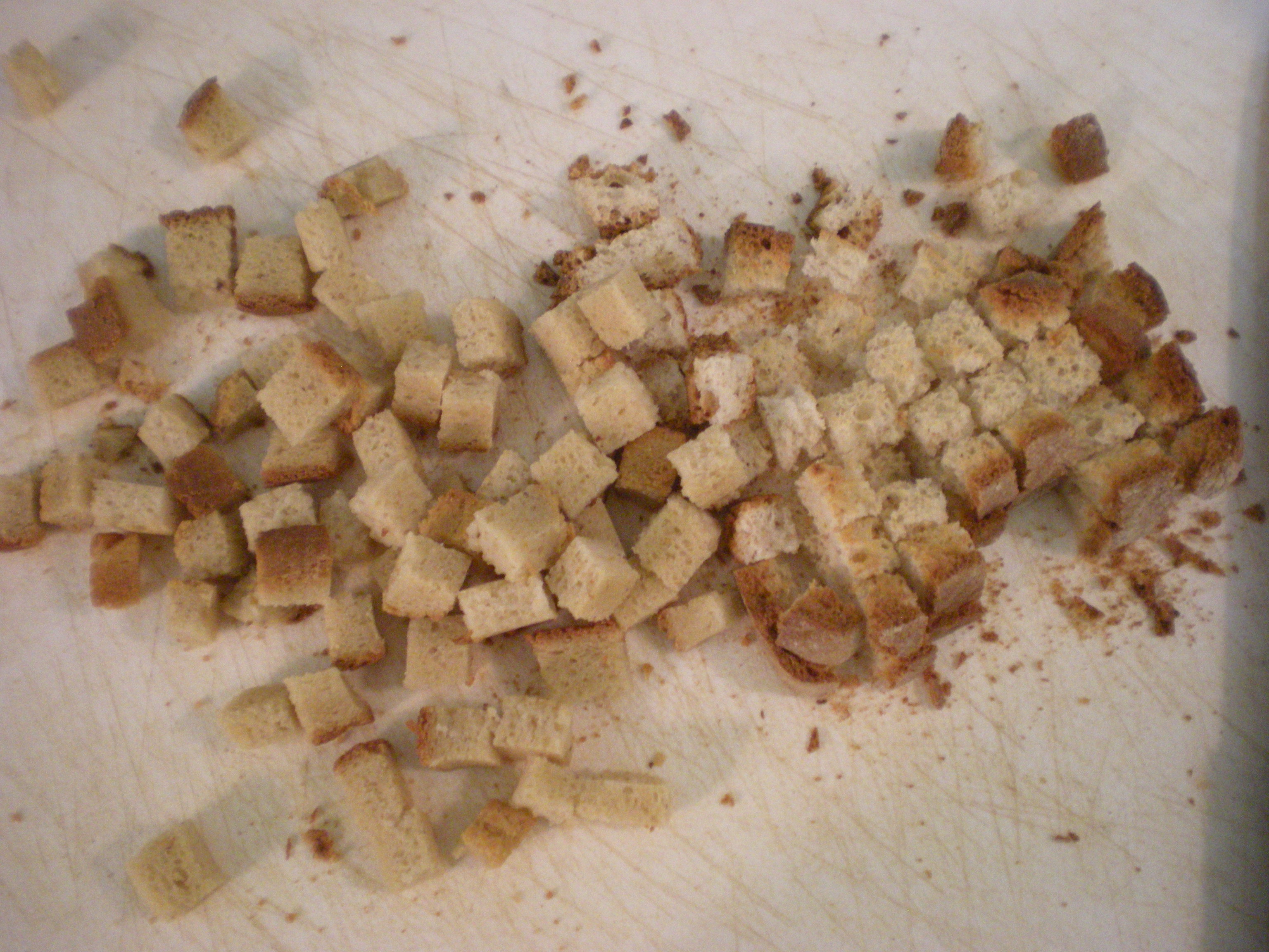 Toast the bread on a cookie sheet in the oven until lightly golden brown and crispy, but not burned. Remove from the oven, cut into small cubes, and set aside.