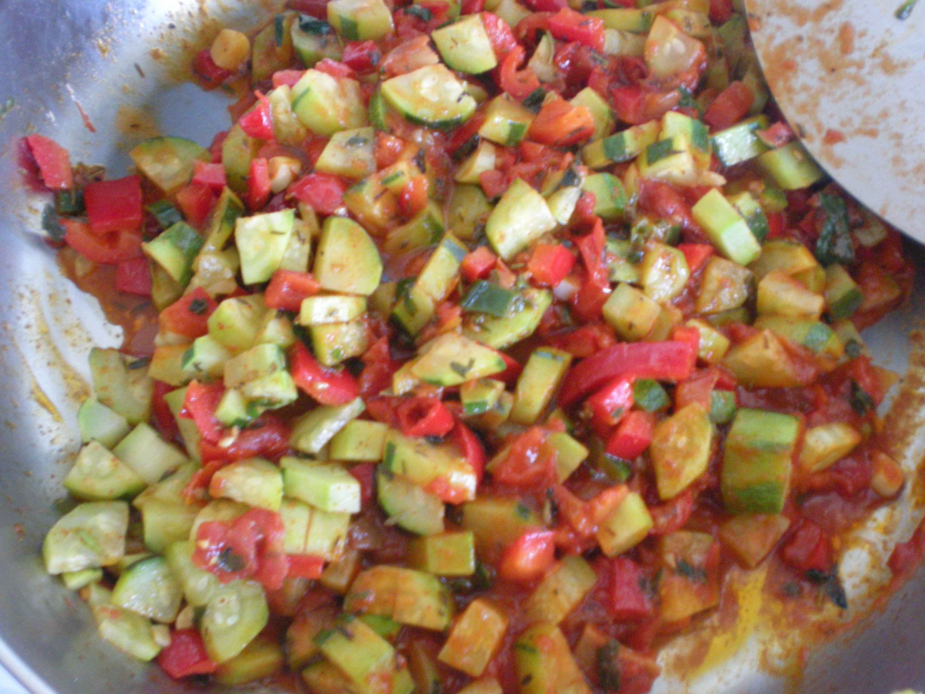 One of our neighbors introduced us to a non-vegetarian version of this dish. We loved the flavor of the spices she selected and wanted to make this in a vegetarian version to share with all of you. If your garden is offering an abundance of zucchini, squash, peppers, tomatoes, etc. this dish is perfect for highlighting any number of these vegetables in it.