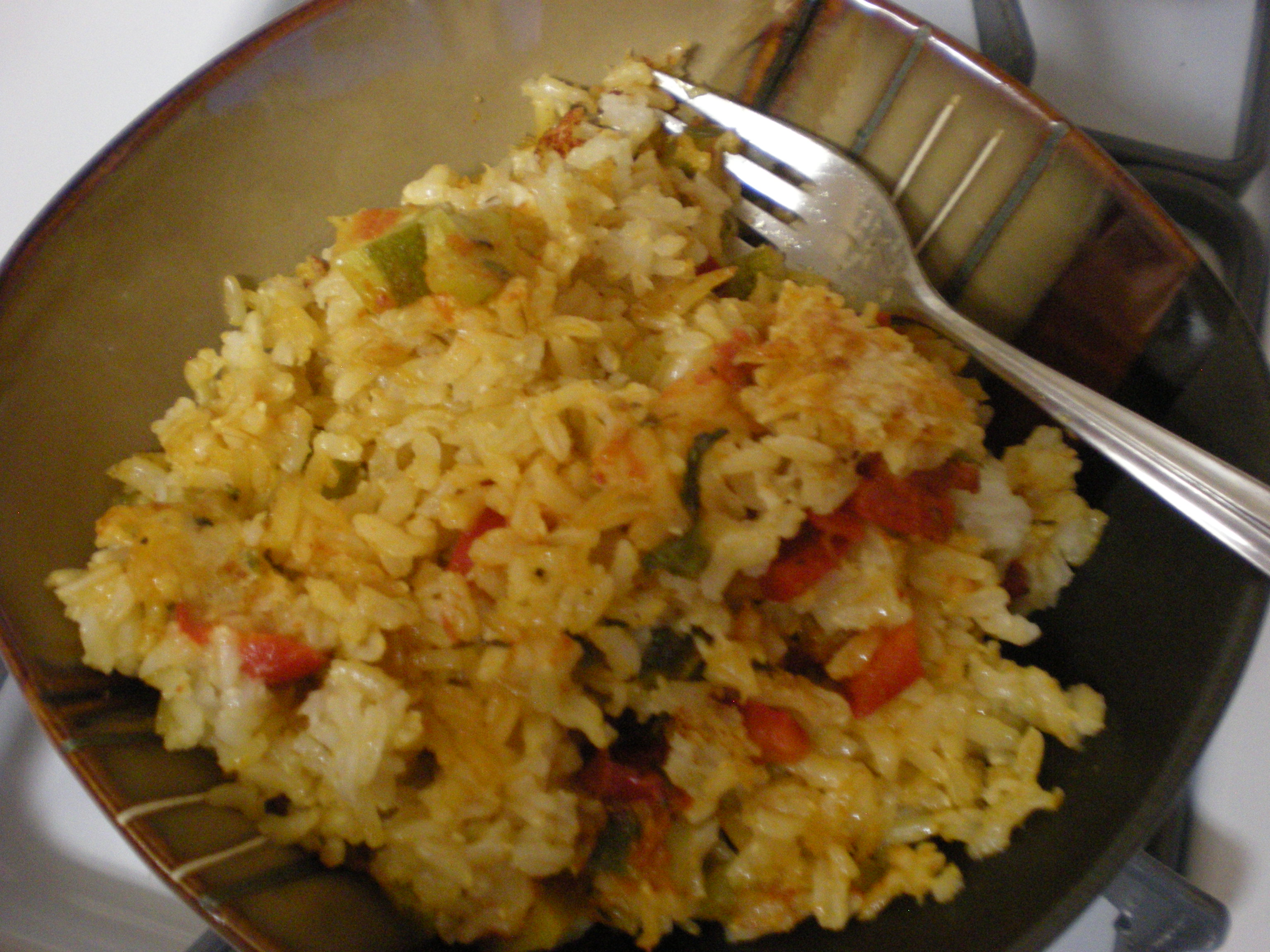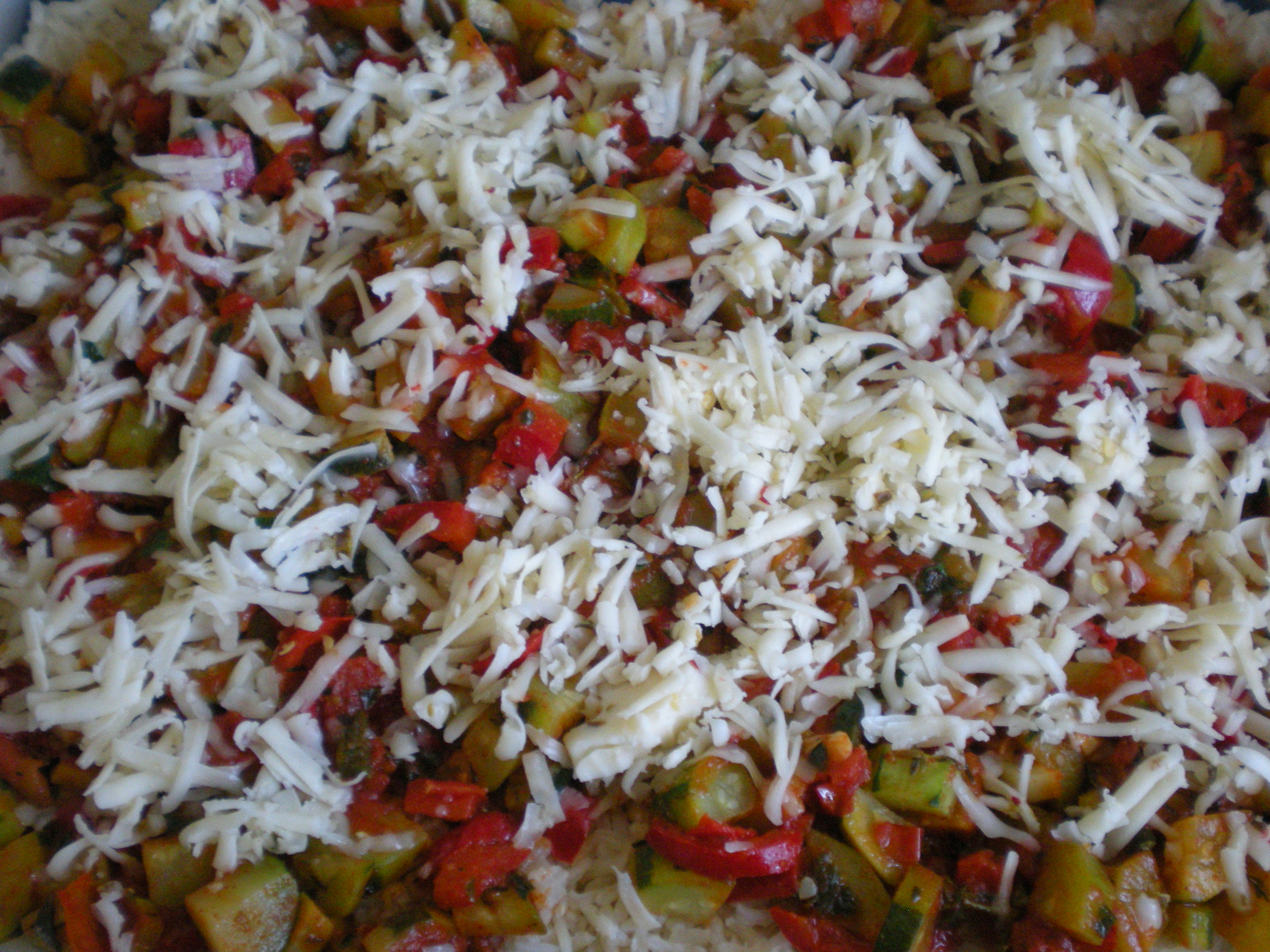 Prepare a large glass casserole dish by spreading out 1-1/2 Tbsp. of olive oil in the bottom of the dish. Add half of the cooked rice to the dish, spreading it out evenly. Top with all of the prepared vegetables, herbs and seasoning. Use half of the shredded cheese and sprinkle over the vegetables.