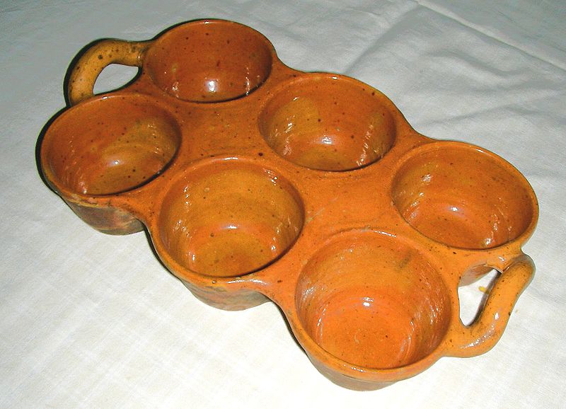 Since living gluten free, popovers are not a recipe we have made very often. Baking anything gluten free presents enough challenges, but baking without the use of baking powder, or other leavening agents, seems daunting to say the least – if not downright impossible. Since Julia’s recipe does not call for any sugar, we felt more inclined to give this a try. Popovers actually reminded me of a dish I grew up with in Germany, called ‘Pfitzauf.’ It is a Swabian Southern German recipe prepared with a little sugar, and mostly served with a hot fruit compote. Many times my mother would make this on a Friday for lunch, after coming home from school – a perfect finish to the end of a school week. When setting aside the ingredients for this recipe and looking for an appropriate baking pan, I also recalled that my mother used some kind of an oven proof earthenware dish, looking somewhat like this image, courtesy wikipedia.