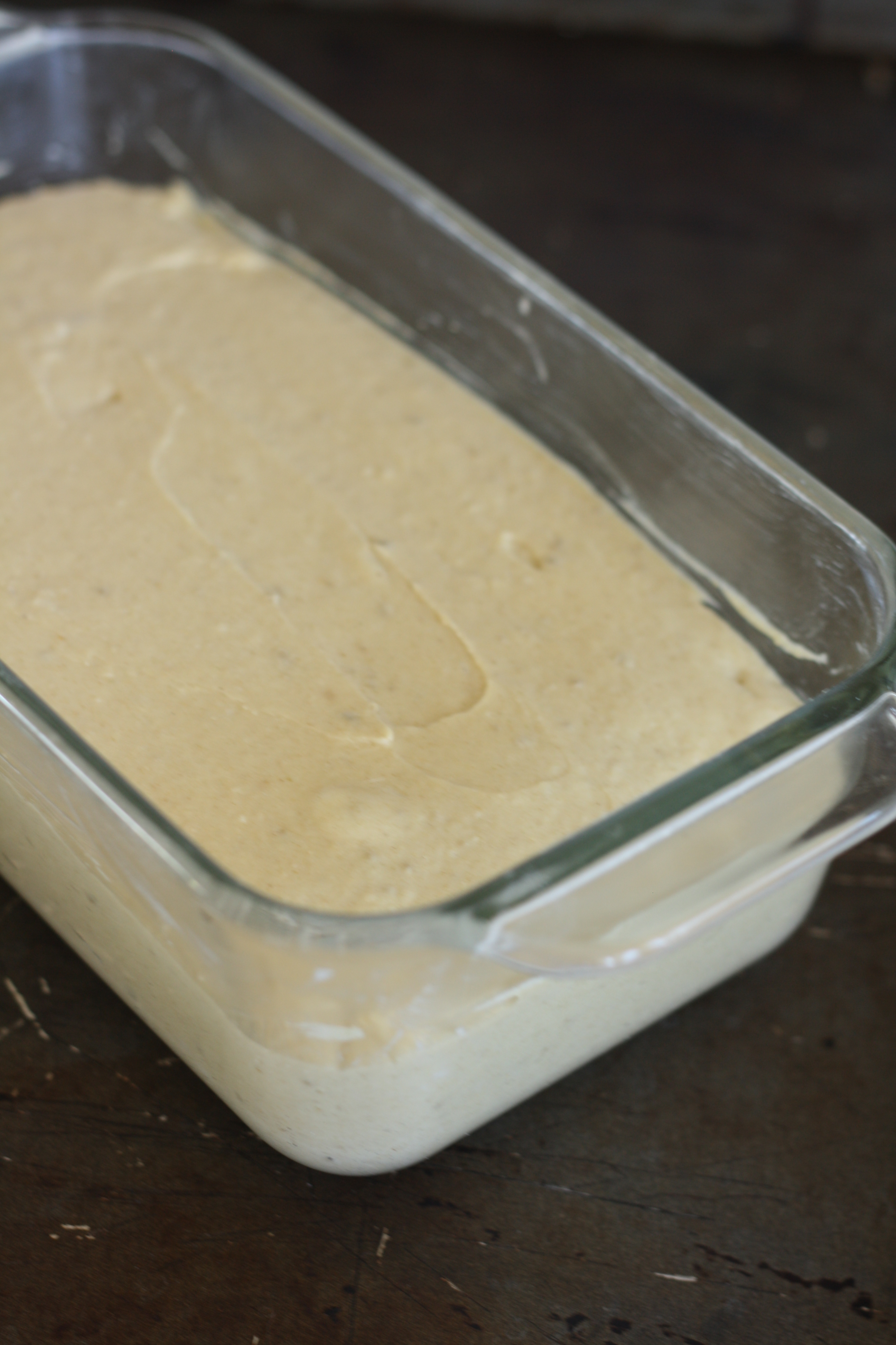 For those of you that have never before baked bread gluten free, you can completely eliminate any thoughts of handling the dough, kneading the dough or attempting multiple risings. Gluten free bread dough looks and acts more like cake batter. You blend the ingredients with a mixer and then pour the batter into the loaf pan, rather than knead and shape it. It should, however, not be too liquid, but nevertheless pourable. The loaf pan should be filled no more than half full, to allow for the dough to double in height.