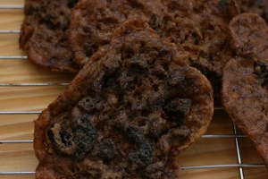 What a mess. Everything about the recipe seemed fine right up until it was time to bake. The dough was chilled for the required amount of time, and then dropped by the tablespoonful onto sil-pat lined baking sheets. After ten minutes in the oven, the butter was clearly the winner. It went everywhere. We almost gave up the idea of making this recipe again after ending up with such greasy, wafer thin “cookies.” To be honest, they really didn’t resemble cookies at all. Is it the elusive special Parisian butter, or the Parisian air that makes the recipe in the book work? Who knows? It certainly didn’t work for us.